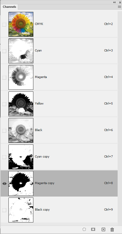 Решается все достаточно просто в фотошопе, циан с маджентой вычитаются друг из друга и из черной. Получается 3 непересекающиеся маски.