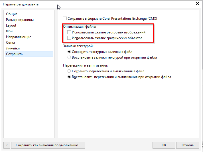 Эти галки работают при сохранении в предыдущие, до-zip (riff) версии CorelDRAW.Я так и понял, что при каждом сохранении происходит сжатие всех данных.