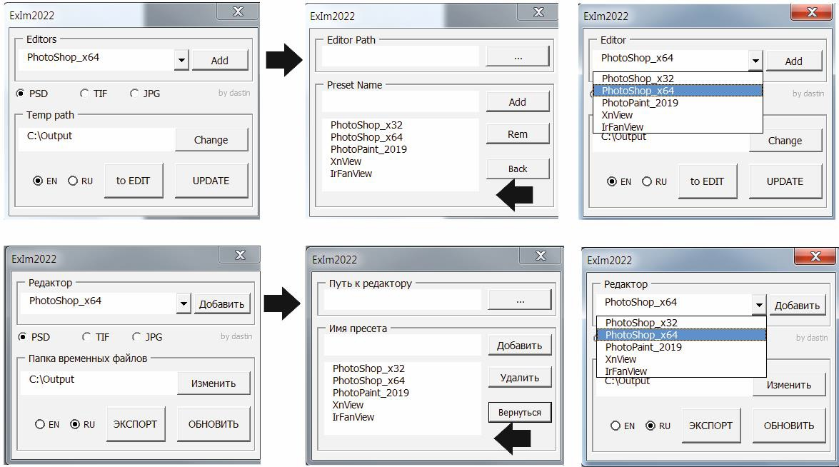 язык интерфейса EN/RU и редактор (хоть ItfanView, главное чтобы он поддерживал выбранный тип файла) из сохранённого списка.