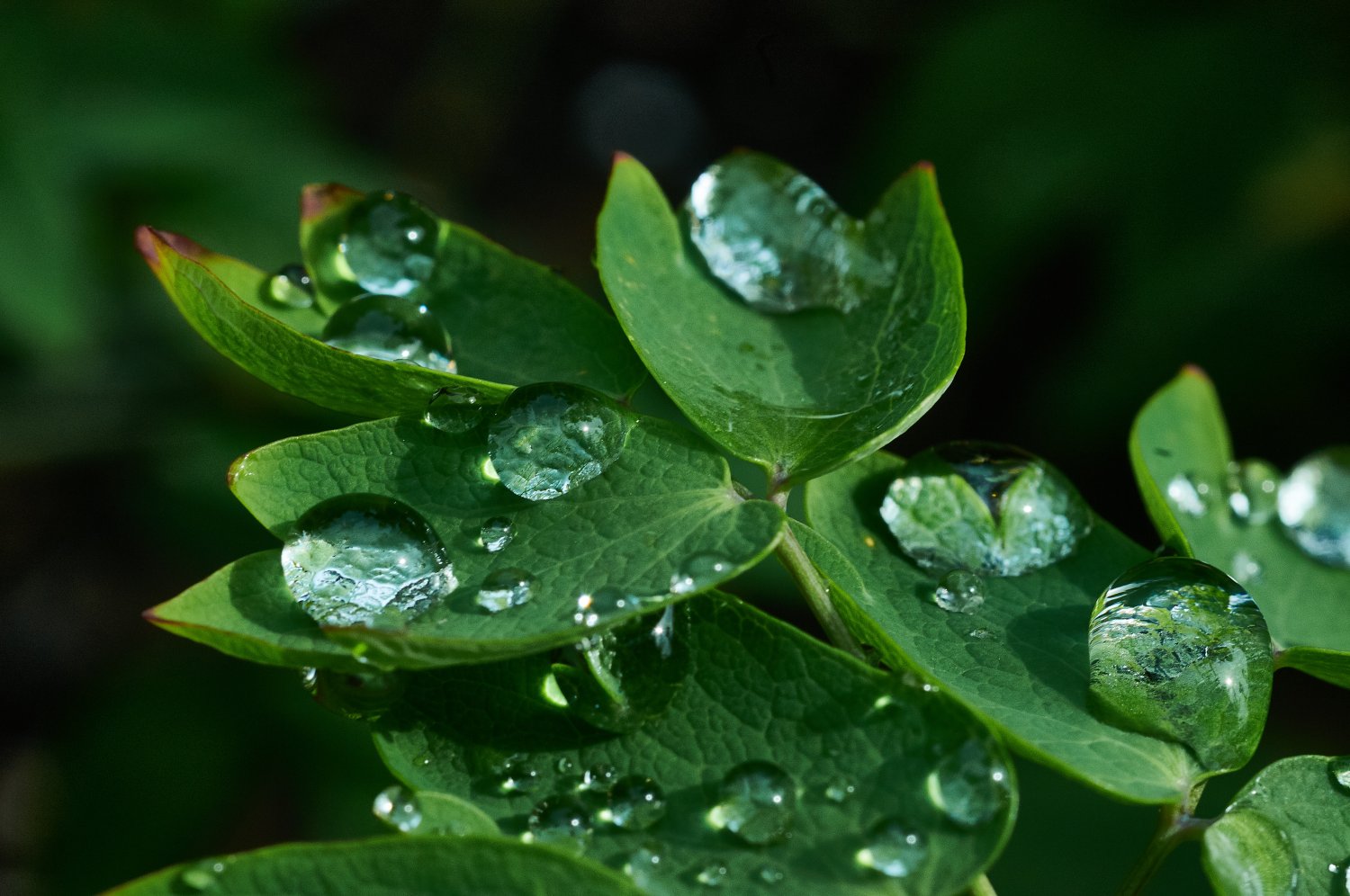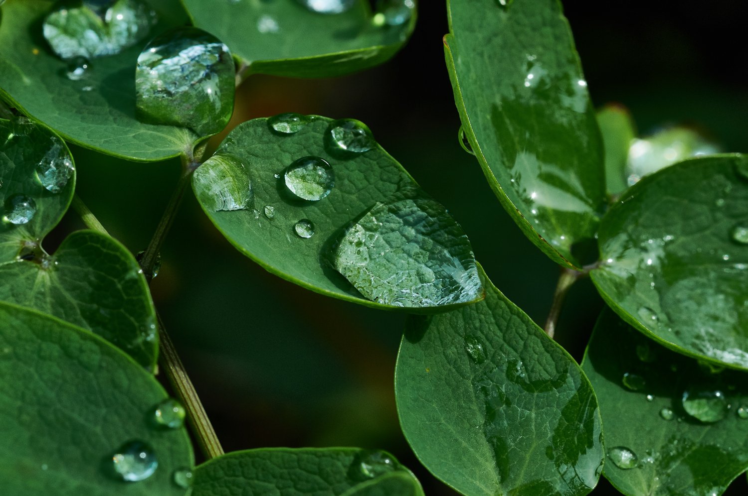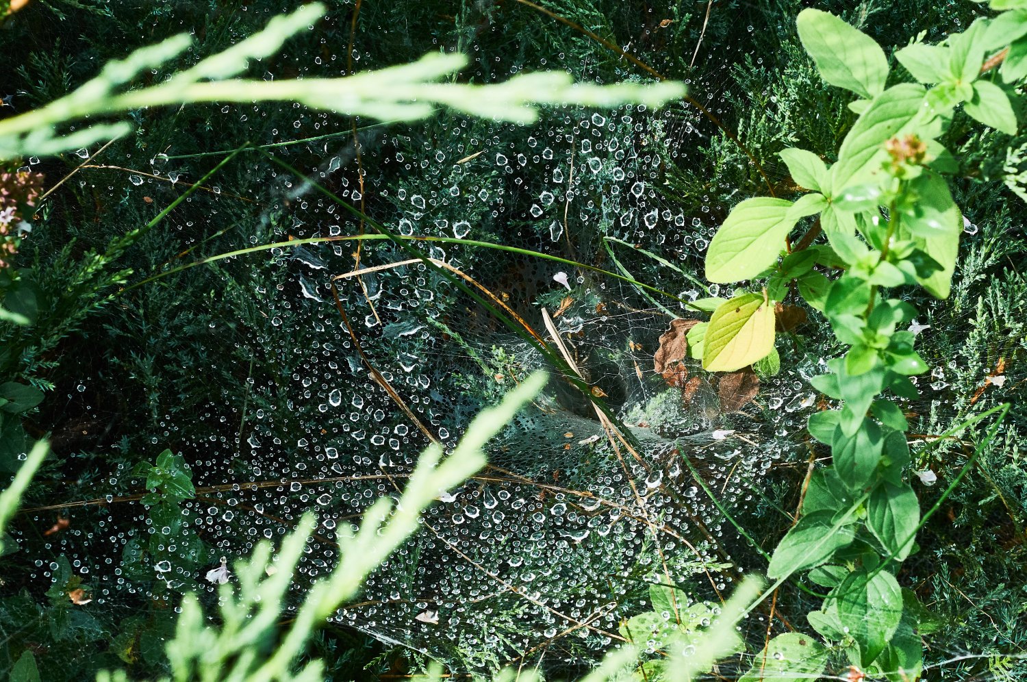Дождь, уже дней 7 подряд. Цветы, листья, паутина возле дома.