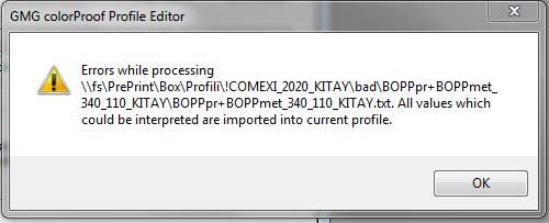 Добрый день, подскажите, что я делаю не так. Я хочу сделать импорт измерений (для построения mx4 профиля) в GMG Profile Editor не через lab из ICC, а через текcтовый файлик, который получается после промеров Measure Tools (прямые измерения со спектрофотометра, как я понял). Но PE упорно не принимает их, причем как я понял из сообщения об ошибке это и не ошибка вовсе, но значения не появляются. MT 5.0.10, GMG Color Proof 5.9.0.406