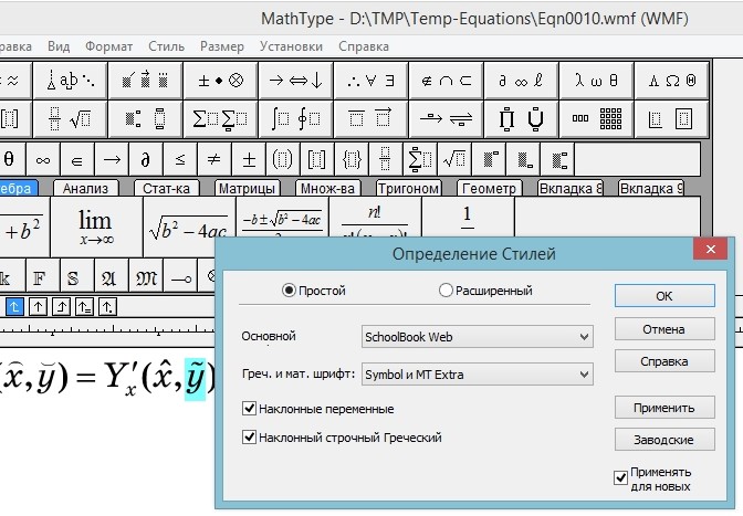 Если в MT в стиле «Функция/Function» проставить Euclid, то отображает правильно, но тогда шрифт функций (sin, cos и пр.) не совпадает с основным для формул. Думал тогда присвоить Пользовательские стили для функций (как костыльный вариант), но при этом пропадут отбивки у функций, заложенные в МТ.