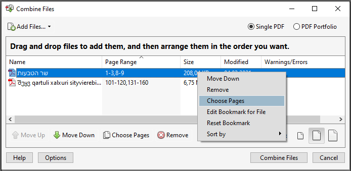 2) Add Files -> Добавить файл в список -> Два раза щелкнуть по файлу, появившемуся в списке -> Задать "Page Range" списком страниц, который присылают вместе с файлом -> OK -> Combine Files