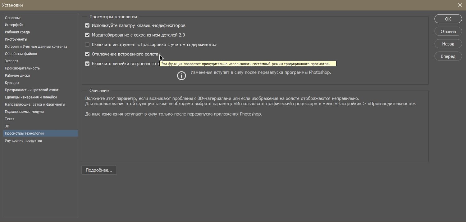 OpenCL: позволяет ускорить новые фильтры Галерея размытия, Умная резкость, Выделение > Область фокусировки или Размер изображения с установленным флажком «Сохранить детали». (Примечание. Использование OpenCL доступно только для новых графических карт, которые поддерживают OpenCL версии 1.1 или более поздней версии.)