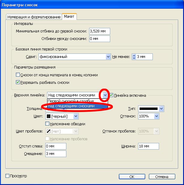 А, вот вы про что... Я сначала не понял. Там был скриншот условный, не из вёрстки - просто для иллюстрации того, где найти параметры линейки над продолжением сноски.Но я поставил вместо фиксированого сдвига, интерлиньяж тоже 3 мм