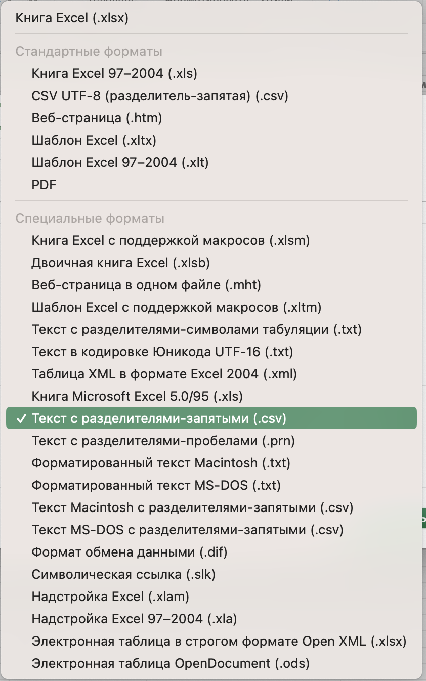 А где найти эти настройки в excel? Когда я выбирают любой csv он просто сохраняет и всё, без каких-либо настроек + индиз не понимает кодировку в csv. Как быть?)Непривально.