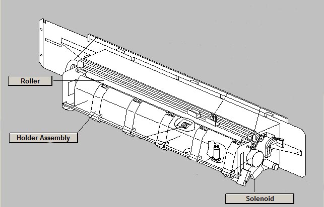 Там есть штанга с ламелями ("Holder Assembly"), которая откидывается при выводе полного формата (для образования петли перед выходным валом "Roller"). Над петлей концевик, в который она упирается и говорит аппарату, что буфер петли полон. Так вот штанга с ламелями, после ухода плёнки в проявку, должна падать обратно - это делает специально обученный электромагнит (тот, что "solenoid" на выходном юните со стороны экрана). Магнит хитрый, с пружинкой на штоке, которая упирается в рычаг возврата. Если пружинка утрачена, или неправильно одета, или погнута, то у штока не будет возможности разогнаться и стукнуть по рычагу, роняющему штангу с направляющими ламелями. Проверьте работу электромагнита - роняет-ли он штангу с ламелями. Это делается с открытой верхней крышкой и читером в замке безопасности верхней крышки (можно просто отвинтить ключ от крышки и вставить в замок). Плёнка, выходя снизу, должна направляться ламелями на выходной вал, а когда его достигнет, должна создавать петлю, выгибаясь вверх и откидывая ламели. После отрезки, плёнка должна уйти в проявку, а ламели остаться откинутыми, после чего магнит должен их уронить обратно.