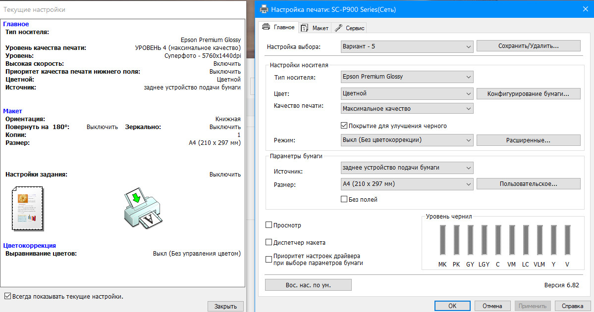 А если измерения тест-карт с пигментных времён не сохранились - то любое из измерений на водянке, измерение экспортируется на соответствующем этапе в i1Profiler. Можно и вовсе напечатать чёрный квадрат из Paint с настройкой принтера "No ICM" и т.д., а потом замерить через i1Profiler, сообщить значение L*a*b*. Но тип бумаги необходимо указать: глянец-полуглянец-сатин-шёлк либо струйная матовая. Основа - fiber или cotton (или что ещё, или основа не указана). Что за конспирация с сортами бумаги, мне не понятно, с коммерческой т.з. скрывать тут нечего, да и для разбирательств с цветом достаточно указать один только материал. В целом, если у вас на восьми сортах одно и то же безобразие, то очевидно, что виноваты чернила. Или тот, кто их, возможно, не туда залил или не так понял названия цветов. Честно говоря, не понимаю, зачем в роскошный SC-P900, работавший на оригиналке, заливать водянку, доставленную из Китая (т.е. без контроля и постоянства качества, может, там и на баночках этикетки перепутали), рискуя засорить голову (уж надеюсь, что перед сменой чернил вы всё промыли по правилам).