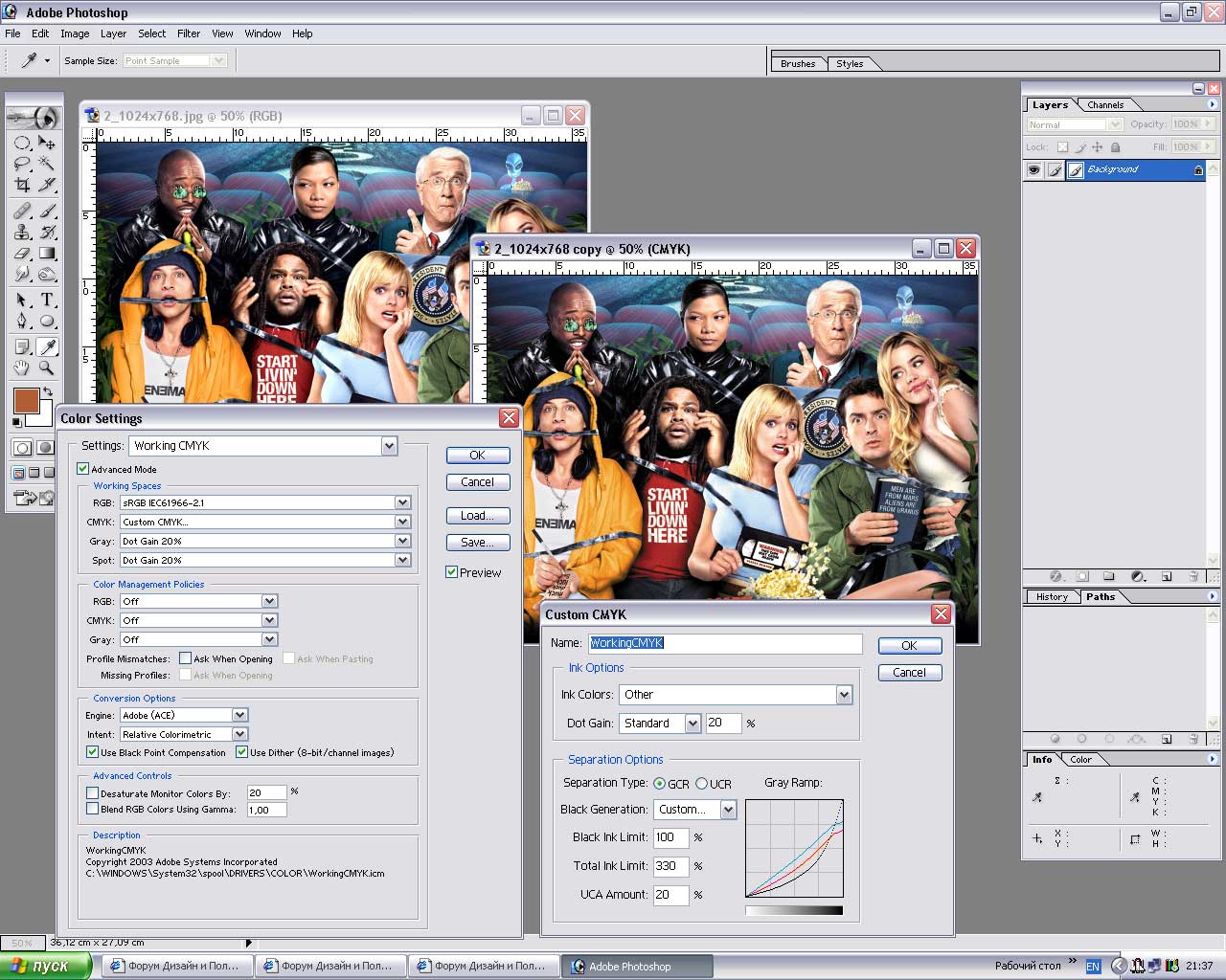 Понятно. С профилями проблема. Классический способ: сохраните настройки цвета как файл. В окне Color Settings есть кнопка Save. Затем загрузите эти настройки на всех других компах в Фотошоп.
