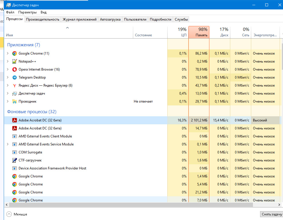 Ребята, помогите, пожалуйста, советом, как решить проблему. Установленный Acrobat Pro DS при неактивном (закрытом) приложении постоянно куда-то ломится и перегружает систему, она виснет напрочь. Это происходит довольно часто, в процессе работы комп виснет, открываешь дистпетчер - а там два этих процесса запустились и подвесили все. Прикладываю скрин диспетчера. В автообновлениях ничего не стоит, вряд ли он туда ломится. Где еще можно поискать проблему? Заранее спасибо огромное за рекомендации.