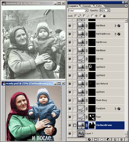 Нужно создать шаблон - сет для настроечных слоев кожи, сет для волос, сет для губ, для одежды можно не создавать заранее. Затем в каждом сете создать несколько настроечных слоев для каждой тональной зоны: света, средние, тени. Затем рисовать по маскам наблюдая за тем что получается. То есть, техника такая: в маске настроечного слоя для средней яркости создается контур полностью, который затем, в масках настроечных слоев для светов и теней используется частично - просто грузите со "средних" селекцию, скрываете ее ребра, и рисуете в "тенях" и "светах" там где нужно. "Средний" настроечный слой - Channel Mixer, света и тени Curves. Не нравится Channel Mixer - юзайте Colorize в Hue\Sat.