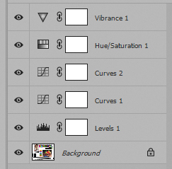 Hue/Saturation 1 – насыщенность; Vibrance 1 — нелинейная насыщенность.
