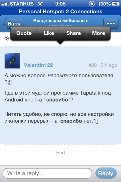 Где в этой чудной программе Tapatalk под Android кнопка "спасибо"? Читать удобно, не спорю, но все настройки и кнопки перерыл - а спасибо нет.*[[